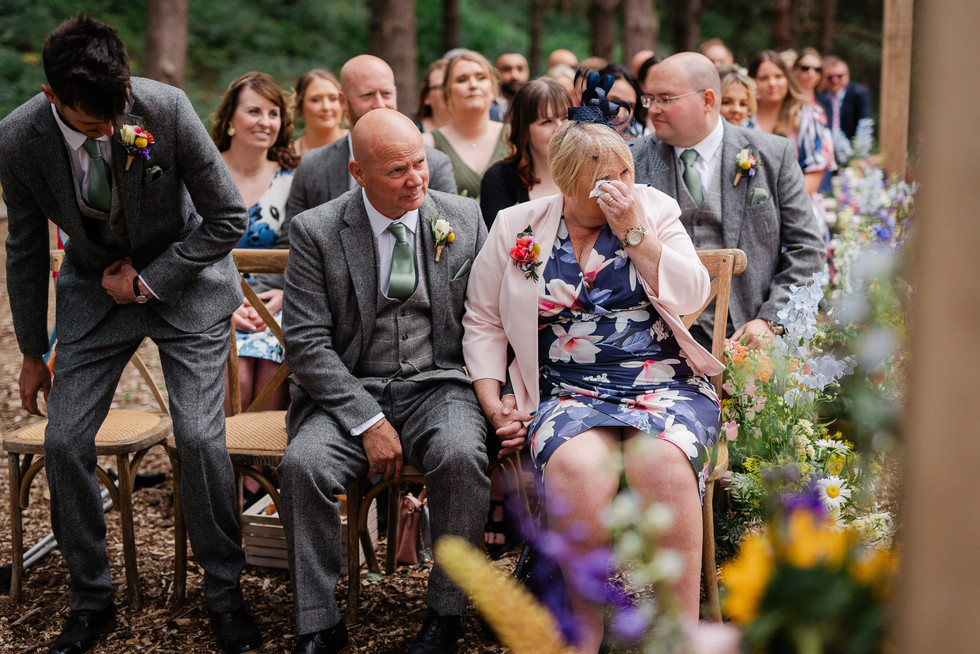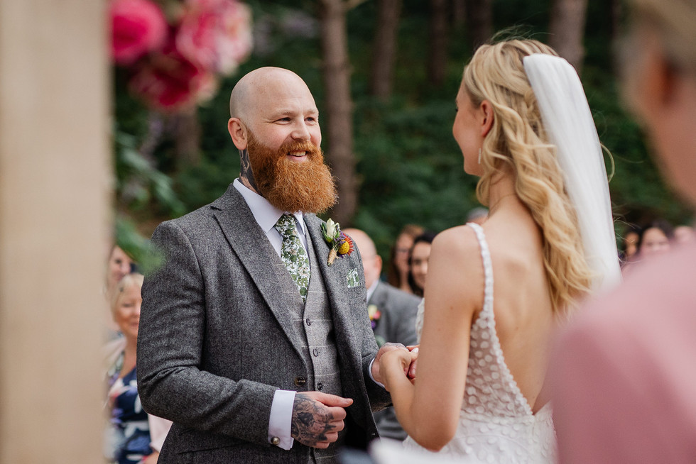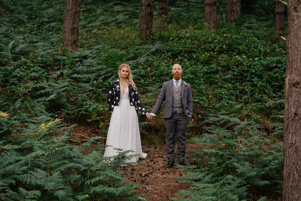 Meanwhile, Ben looked sharp in his grey tweed suit from Peter Posh, with green botanical-patterned tie and matching pocket square.