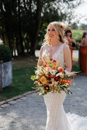 A Floral Tapestry: The couple's floral arrangements were a beautiful combination of sunset hues. Vibrant oranges, yellows, deep purples, and pops of pink created a stunning display, and Leanne's floral hairpiece added a touch of whimsical elegance.